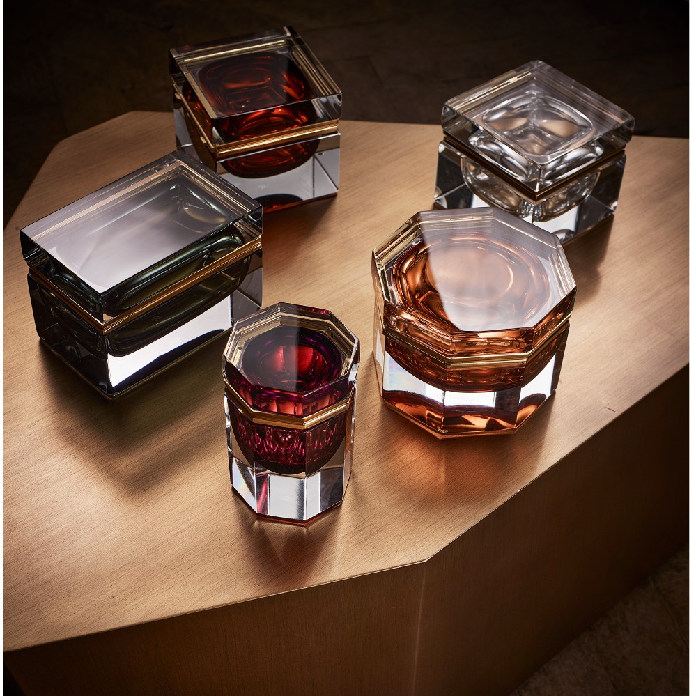 Taking inspiration from various diamond gemstone cuts, our new range of ornamental boxes make the perfect accessory to the world's most beautiful homes. From console tables to chest of drawers and coffee tables, these luxurious boxes easily become the centerpiece of any room. Available in our core range of Beverly Hills collection colours, each box is hand-crafted from heavy layers of Murano glass by our trusted glass masters.