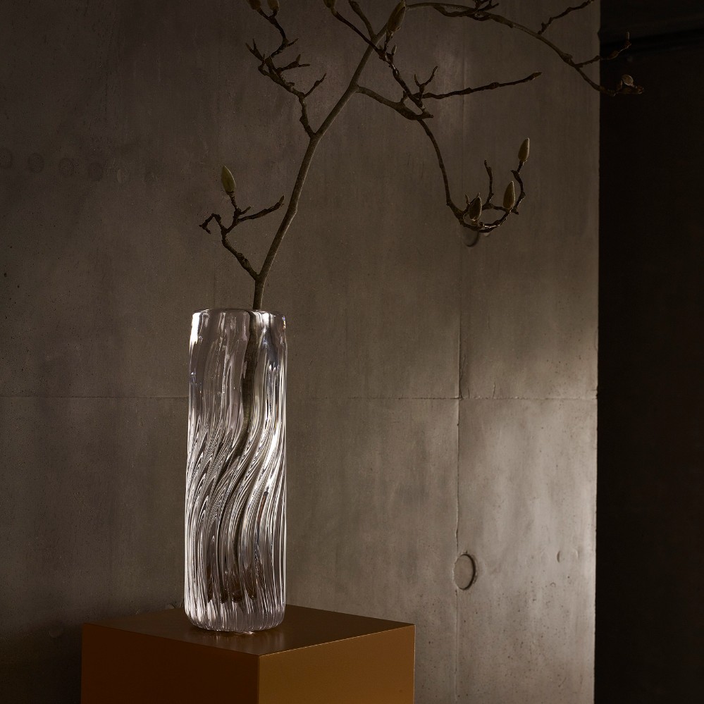 Mesmerising, powerful, and terrifying in equal parts, the ocean is simultaneously the cradle of life itself and a source of eternal dread for men and women since the first boats set out from stony shores. The Wave Vase takes inspiration from this juxtaposition. Fluid in form with its sweeping curved texture, yet rigid and heavy in its thick, cylindrical structure of Murano glass. Hand-crafted by our glass masters, each piece is unique, just like the vitality breeding ocean it takes its namesake from.