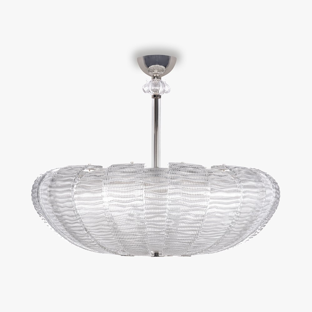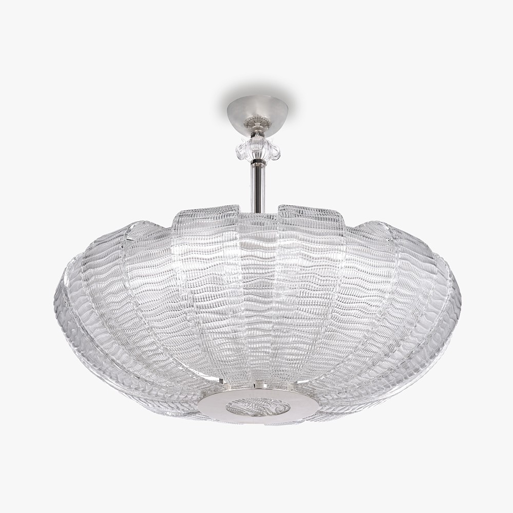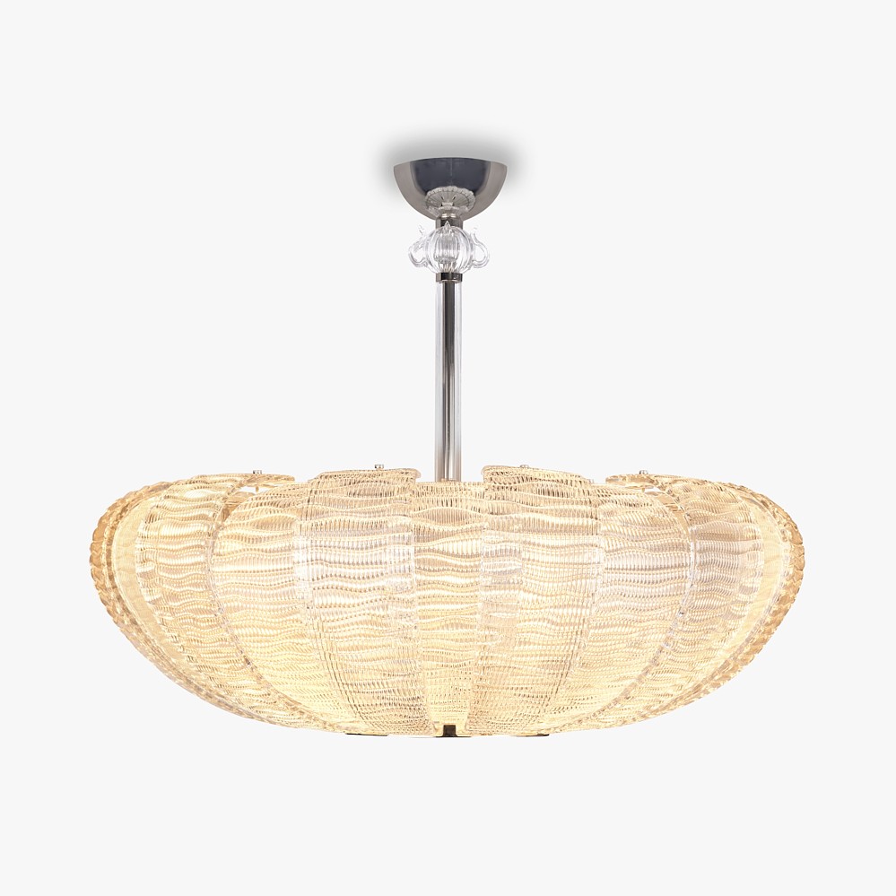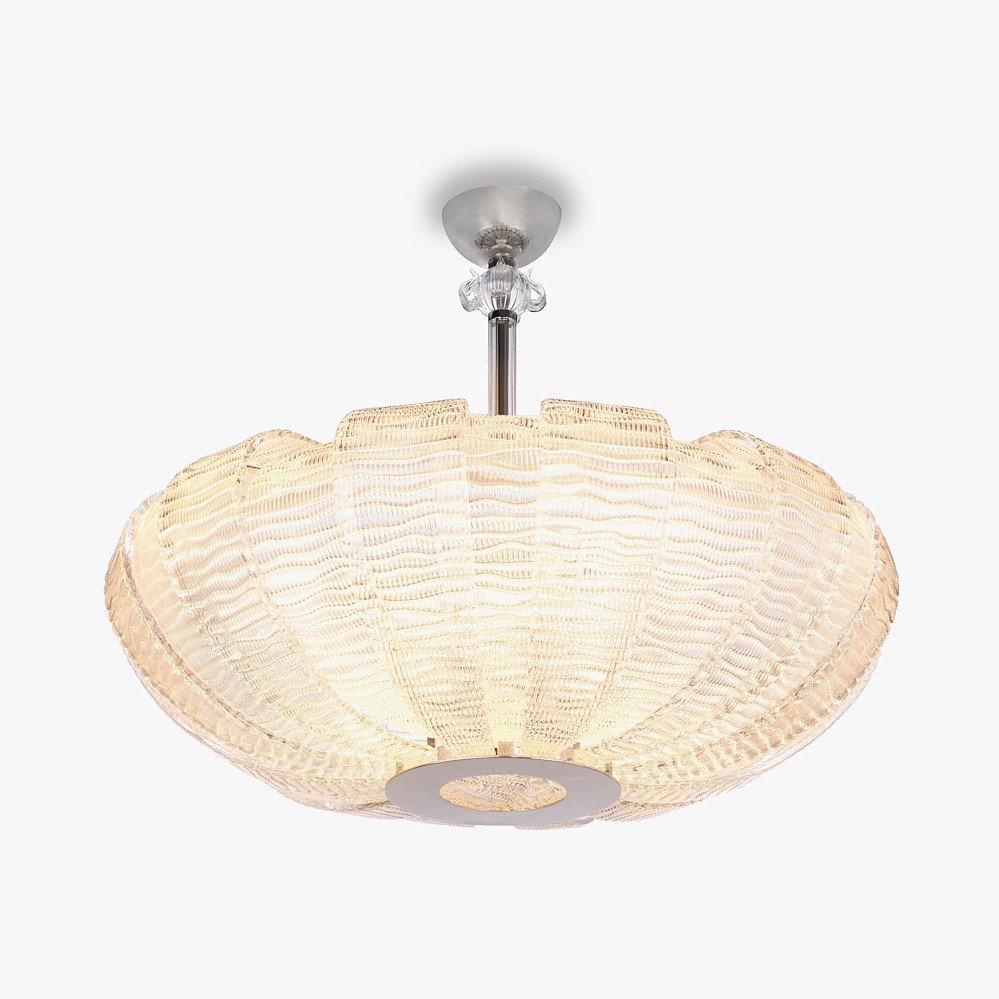 A beautiful chandelier made out of hand-made curved plates of textured Murano glass. Retro and yet beautifully elegant and contemporary.