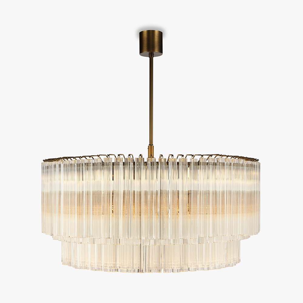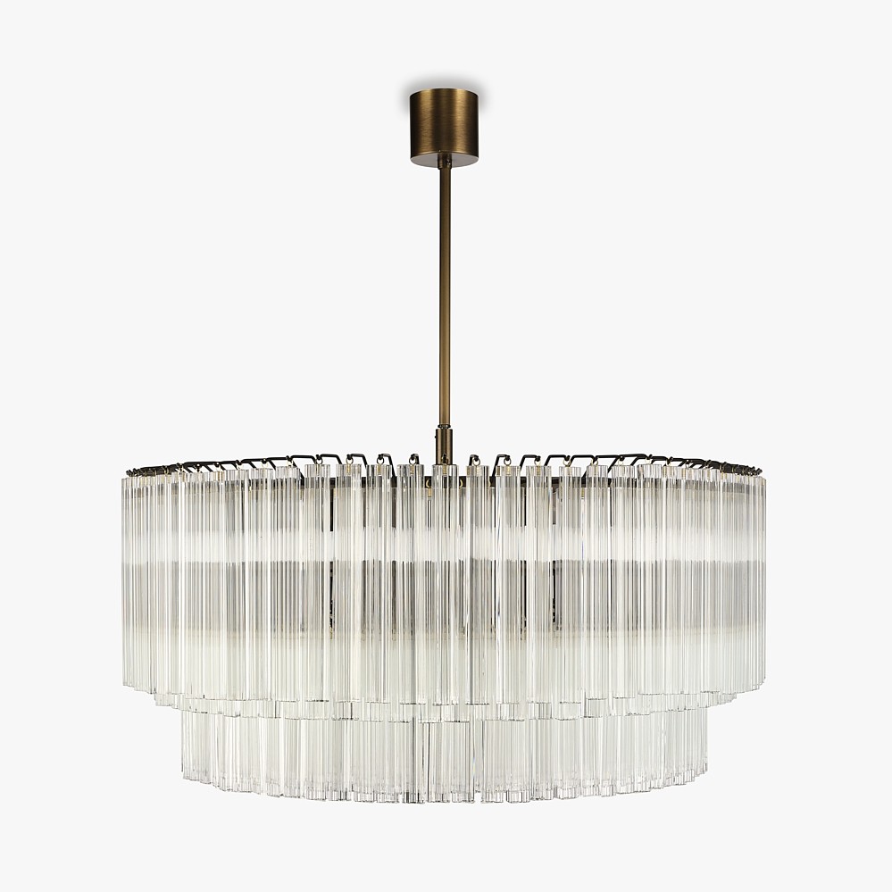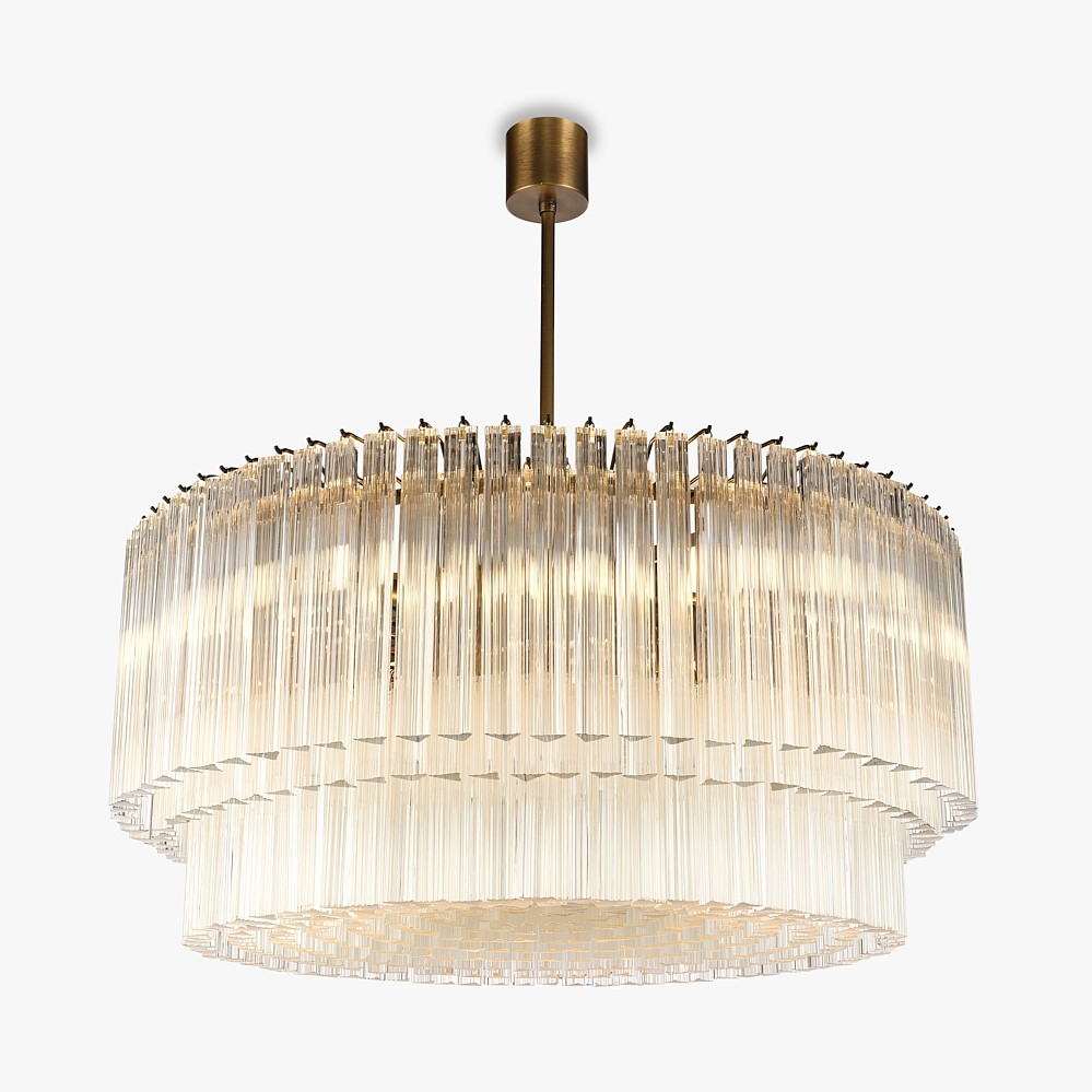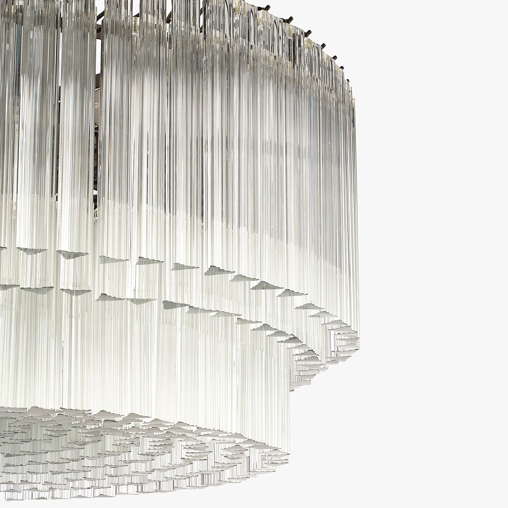 Crafted in triangular flat cut glass, each piece captures and refracts light with crystalline clarity, creating a shimmering interplay of depth and brilliance. The layered concave silhouette enhances this radiance, making it a bold yet refined statement. A modern take on timeless Venetian artistry, the two-tier Concave Chandelier exemplifies elegance, innovation, and enduring design.